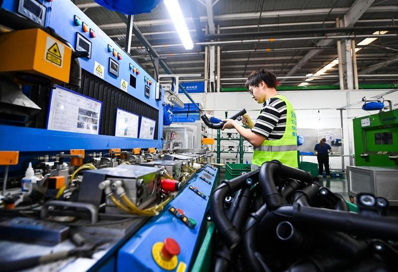 Член на персонала проверява автомобилен гумен маркуч в работилница на Pengling Co Ltd в град Zhongtang, в покрайнините на Тиендзин, Северен Китай, 5 ноември 2025 г. [Photo/Xinhua]