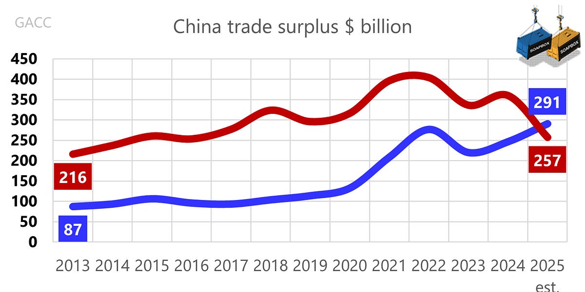 Няколко часа след края на държавното посещение в Китай пресни данни показаха колко малко са се променили. От януари до ноември търговският излишък на Китай с ЕС е нараснал с 20%, до 1,9 трилиона йени от 1,5 трилиона йени година по-рано.