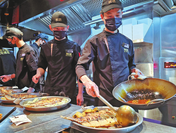 Работници в ресторанта готвят риба на скара в ресторант с пикантна риба на скара на марката Kaojiang в квартал Хайдиан, Пекин, в петък. GENG FEIFEI/КИТАЙ ДЕЙЛИ