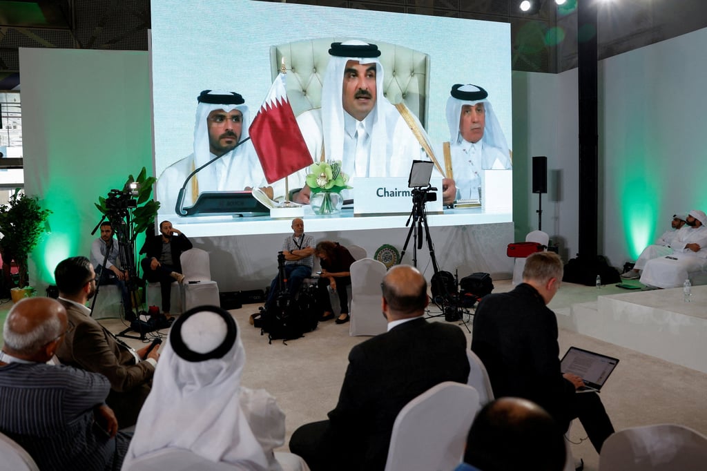 Екран показва, че Емир на Катар говори в понеделник на спешната арабско-ислямска среща на върха, за да обсъди атаката на израелската атака на катарската почва. Снимка: РойтерсЕкран показва, че Емир на Катар говори в понеделник на спешната арабско-ислямска среща на върха, за да обсъди атаката на израелската атака на катарската почва. Снимка: Ройтерс