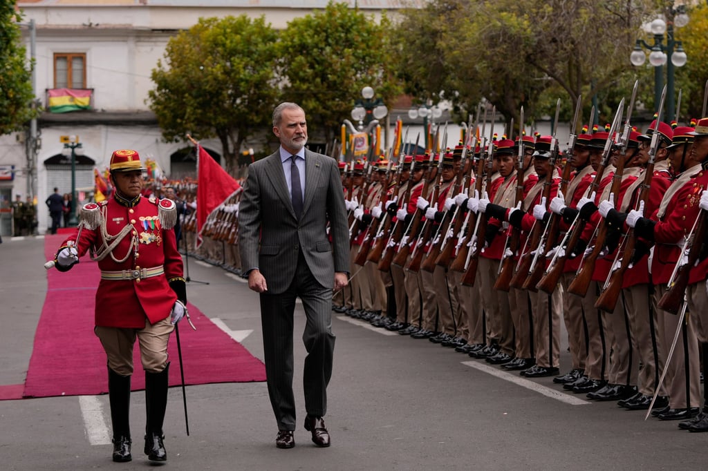 Испанският крал Фелипе получава военни почести в Ла Пас, Боливия, по-рано този месец. Снимка: APИспанският крал Фелипе получава военни почести в Ла Пас, Боливия, по-рано този месец. Снимка: AP