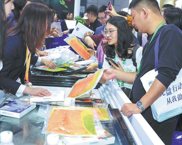 Посетителите купуват норвежки морски дарове по време на осмото Китайско международно изложение за внос в Шанхай на 8 ноември. CHINA DAILY