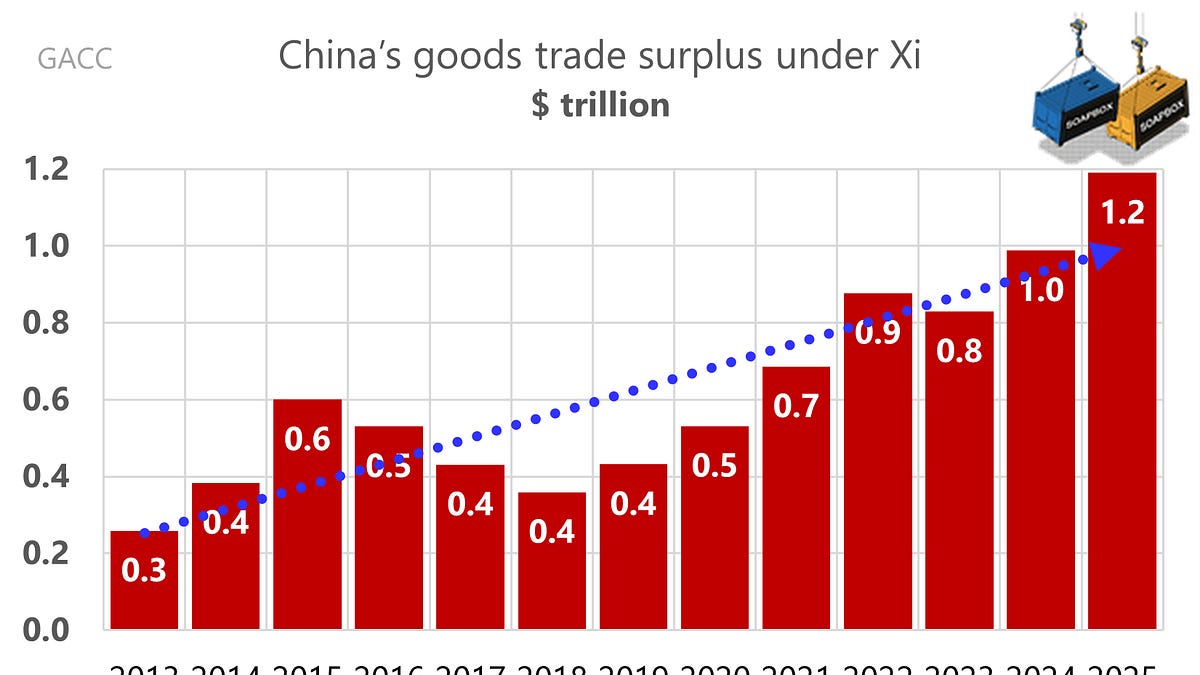 Излишък в търговията със стоки на Китай през годините Xi 2013–2025