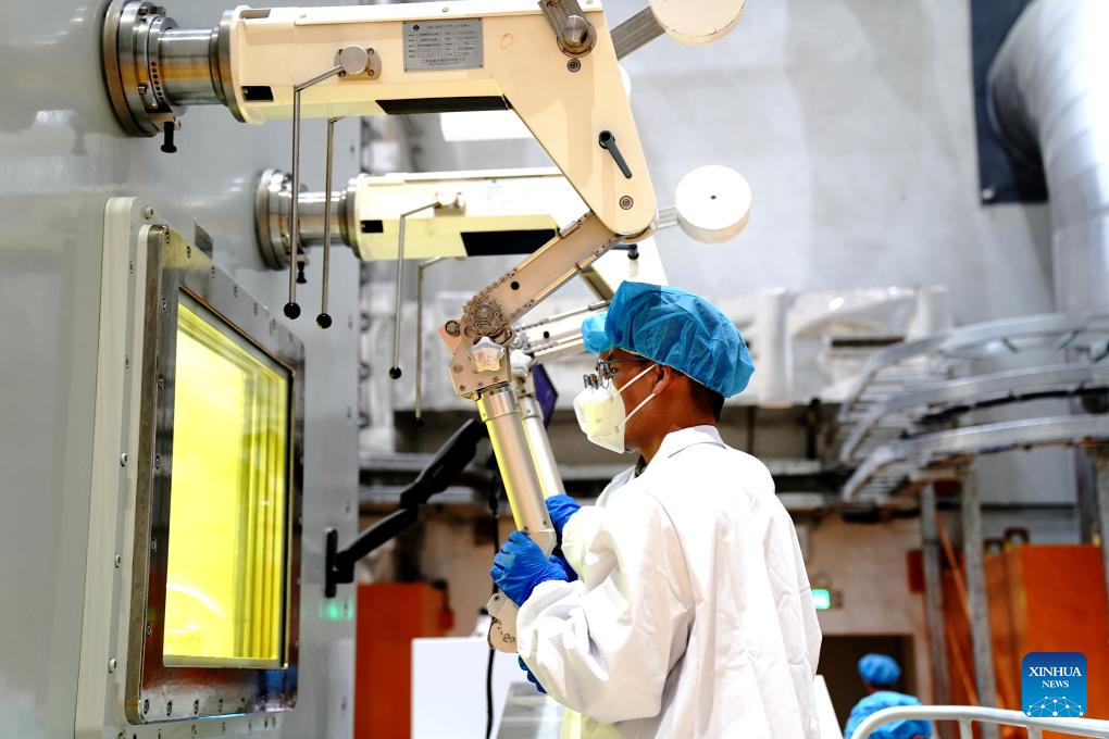 Изследовател работи в горещата клетка за зареждане и вземане на проби на експерименталния реактор за разтопена ториева сол в кампуса Wuwei на Шанхайския институт по приложна физика на Китайската академия на науките в окръг Minqin на град Wuwei, провинция Гансу в Северозападен Китай, 24 октомври 2025 г. [Photo/Xinhua]