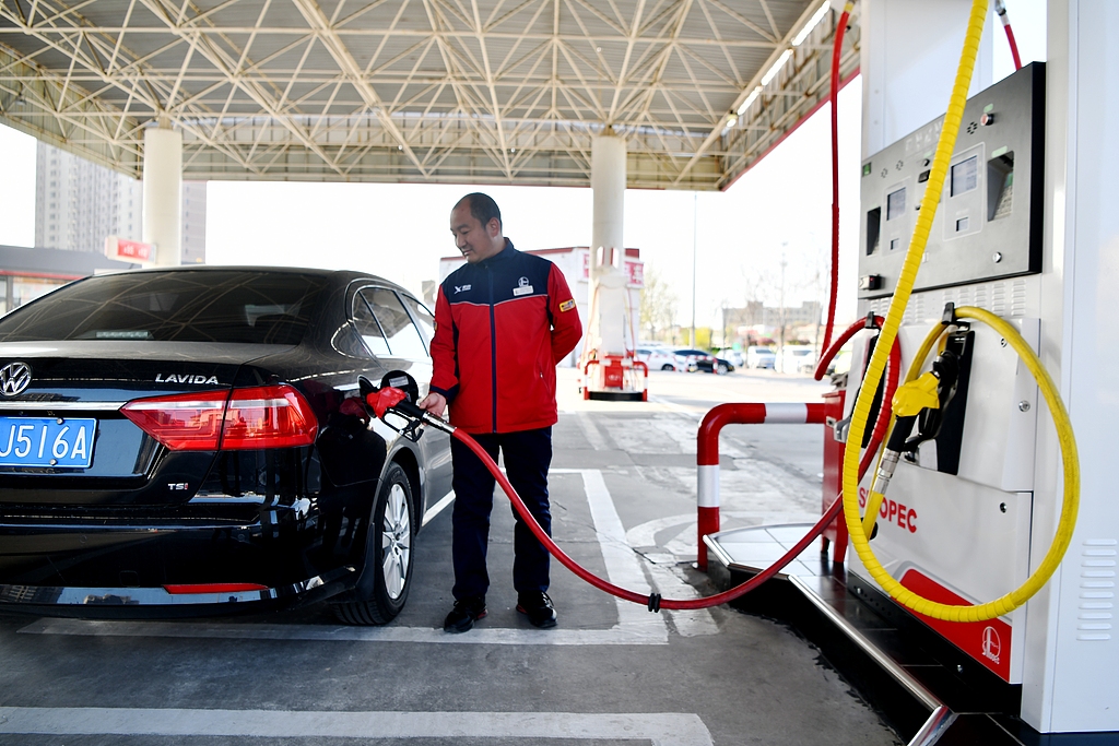Служител на бензиностанция зарежда кола в квартал Luancheng на Shijiazhuang на 7 април 2026 г. [Photo/VCG]