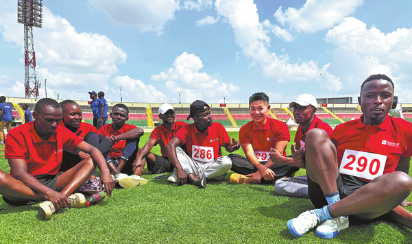 Ли Рунзе (третият отдясно) и неговите кенийски колеги си дават почивка, преди да участват в маратон в Найроби, Кения, през октомври. [Photo provided to China Daily]