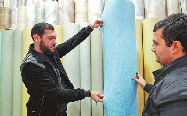 Търговец (вляво) от Ташкент показва на клиенти строителни материали от Гуангюан, провинция Съчуан в магазина си в столицата на Узбекистан на 12 декември. XINHUA
