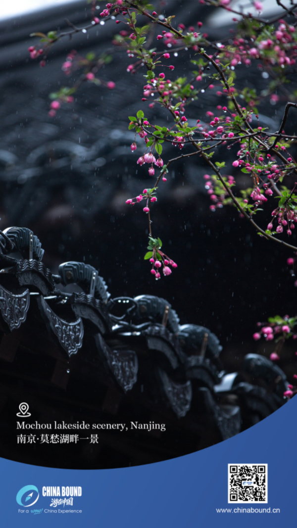 В сезона на зърнените дъждове, един от 24-те традиционни китайски слънчеви термина, отбелязващи последната фаза на пролетта, леки дъждове падат над езерото Мочоу в Нанкин, провинция Дзянсу. Древните покриви тихо улавят дъжда, докато розова цветна пъпка държи блестящи капчици, чакащи да разцъфтят. Подхранвана от дъжда, природата се превръща в пролетна поезия, разкривайки нежния чар и вечната елегантност на региона Jiangnan.