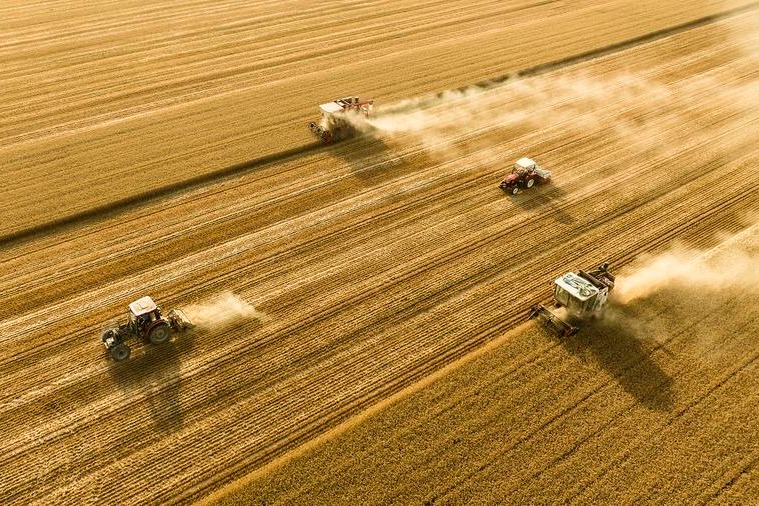 Снимка с дрон показва комбайни, които жънат пшеница в полетата в село Пантанг в град Лижуанг, град Шанкиу, провинция Хенан в Централен Китай, 4 юни 2025 г. [Photo/Xinhua]