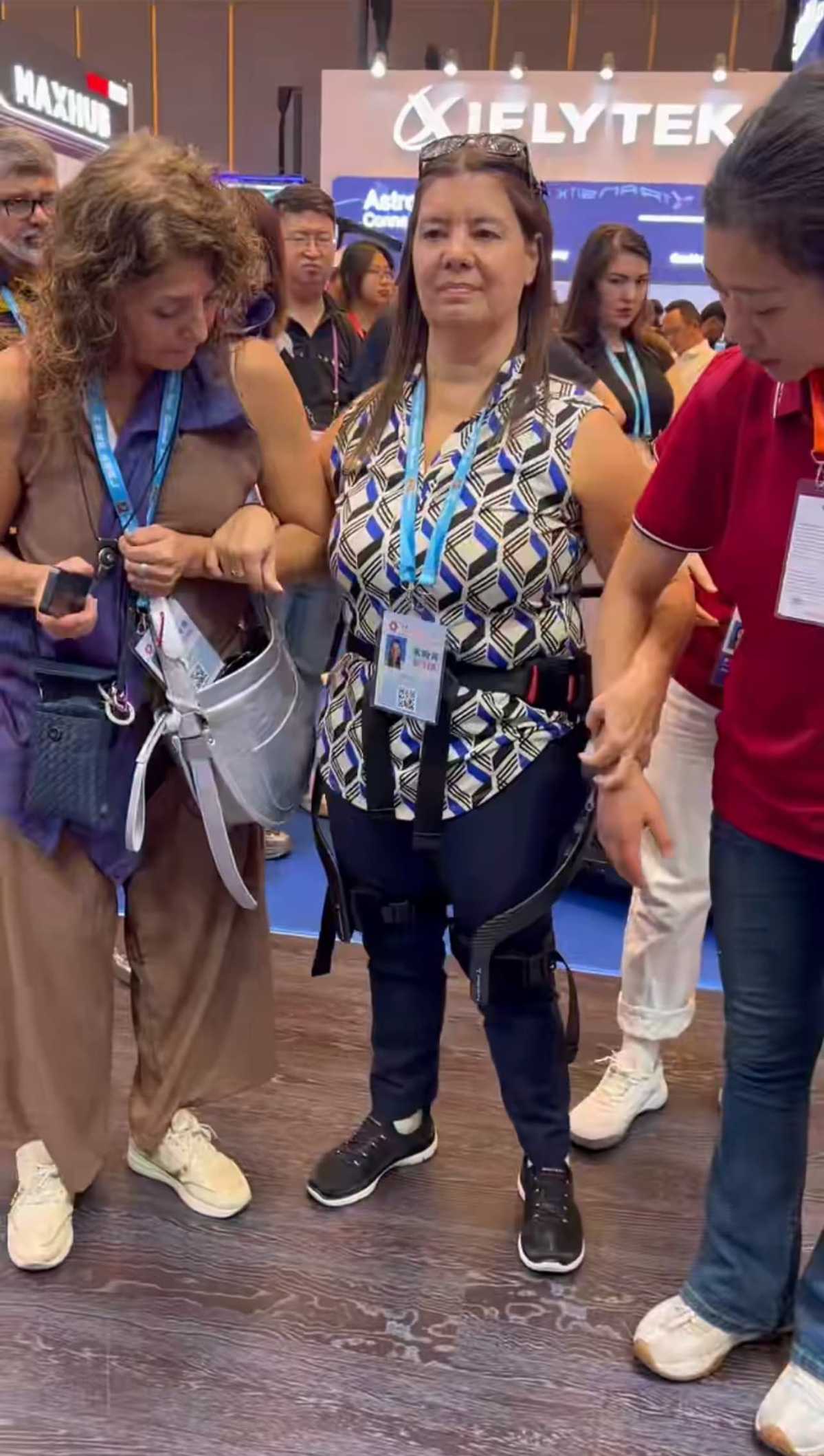 Аржентинка, която живее с увреждания, стана център на вниманието на Кантонския панаир в Гуанджоу, след като беше заснета да стои с помощта на екзоскелетно устройство, разработено от китайска фирма за роботика.