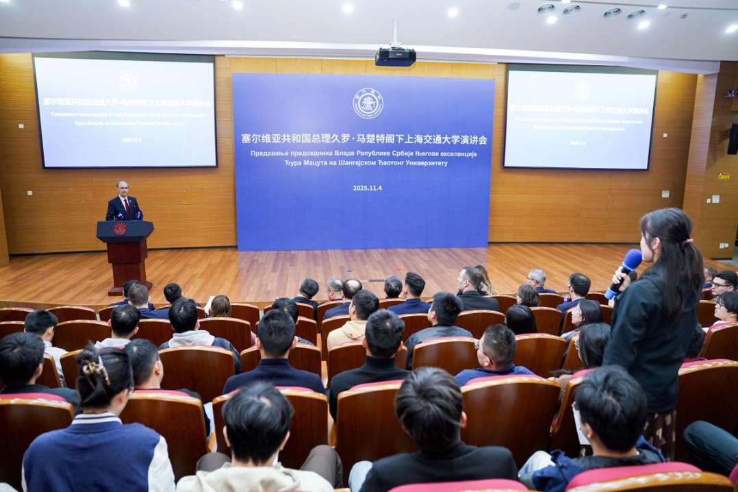 Сръбският министър-председател Джуро Макут отговаря на въпроси на студенти и изнася реч по време на посещението си в Шанхайския университет Джао Тонг във вторник. [Photo provided to chinadaily.com.cn]