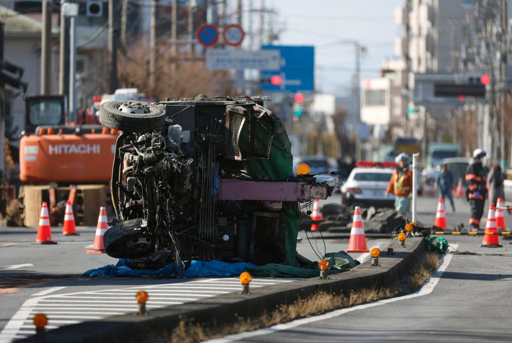 Камионът, изваден от мивка, се вижда на мястото без кабината на шофьора, в Яшио, японската префектура Сайтама, на 31 януари. Снимка: EPA-Efe