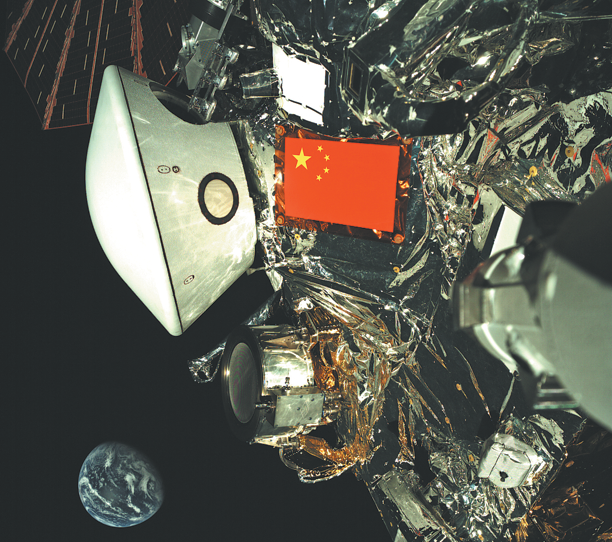 CNSA пусна и изображение, направено от камерата на монитора на занаята, показваща Земята и капсулата за връщане на бял цвят на сондата и национален флаг.